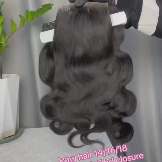 Elevate your style with our premium double drawn raw body wave human hair bundles paired with a 5x5 HD lace closure. This stunning set combines natural beauty, luxurious texture, and exceptional quality for a flawless, glamorous look.